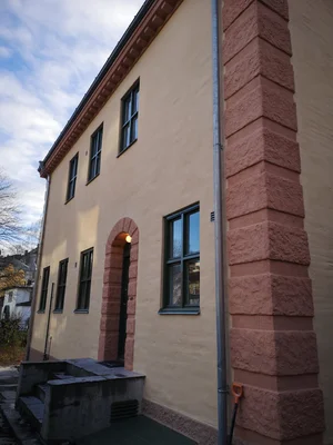 Totalrehabilitering av fasade, gesims, kvadere og sokkel.